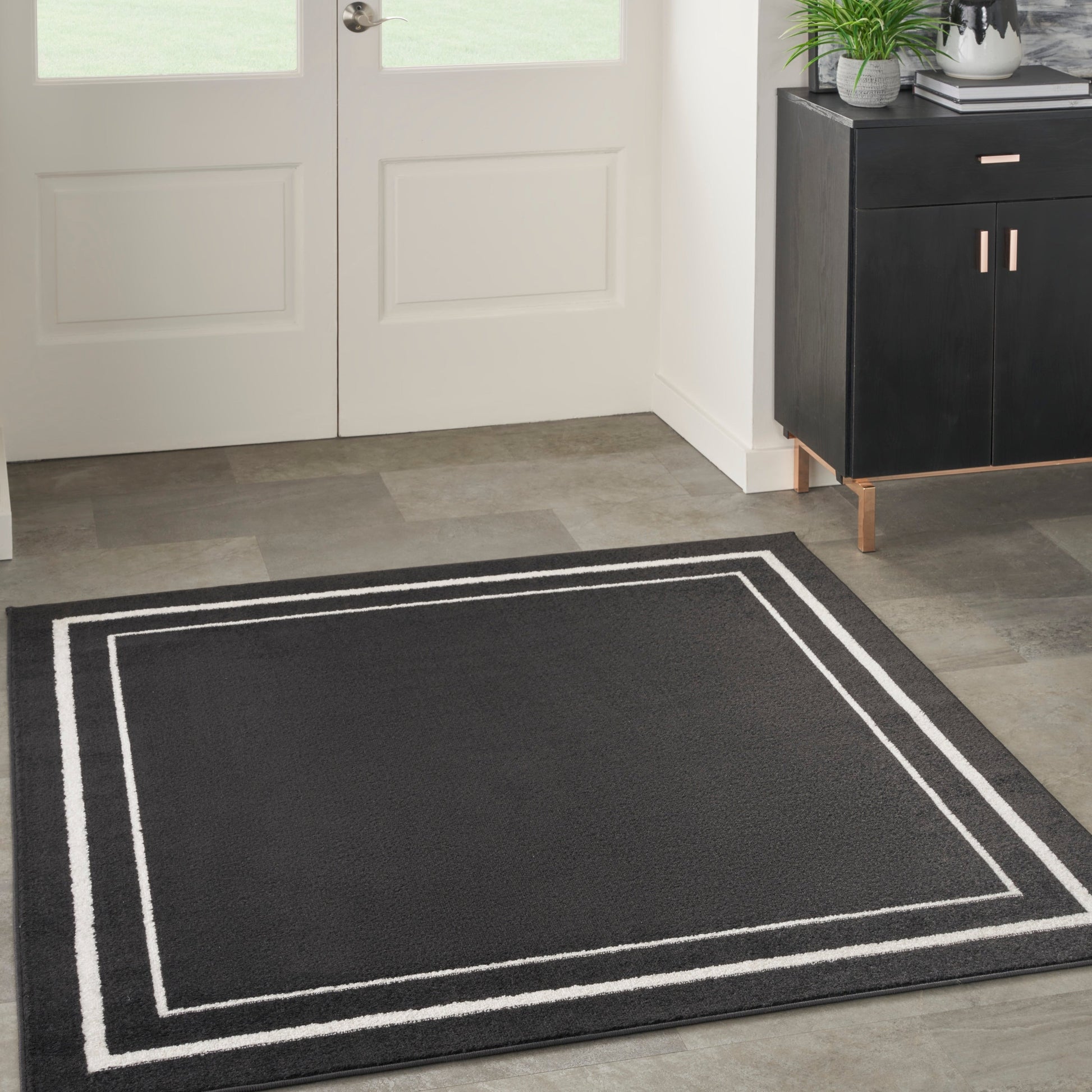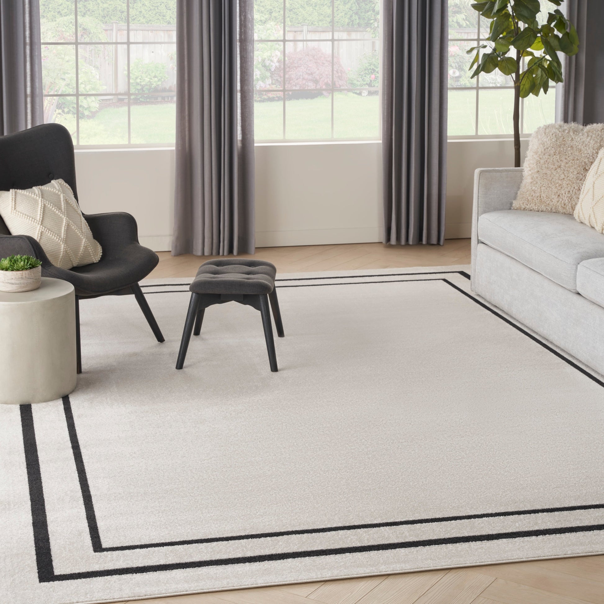 • Contemporary bordered outdoor rug defines conversation areas