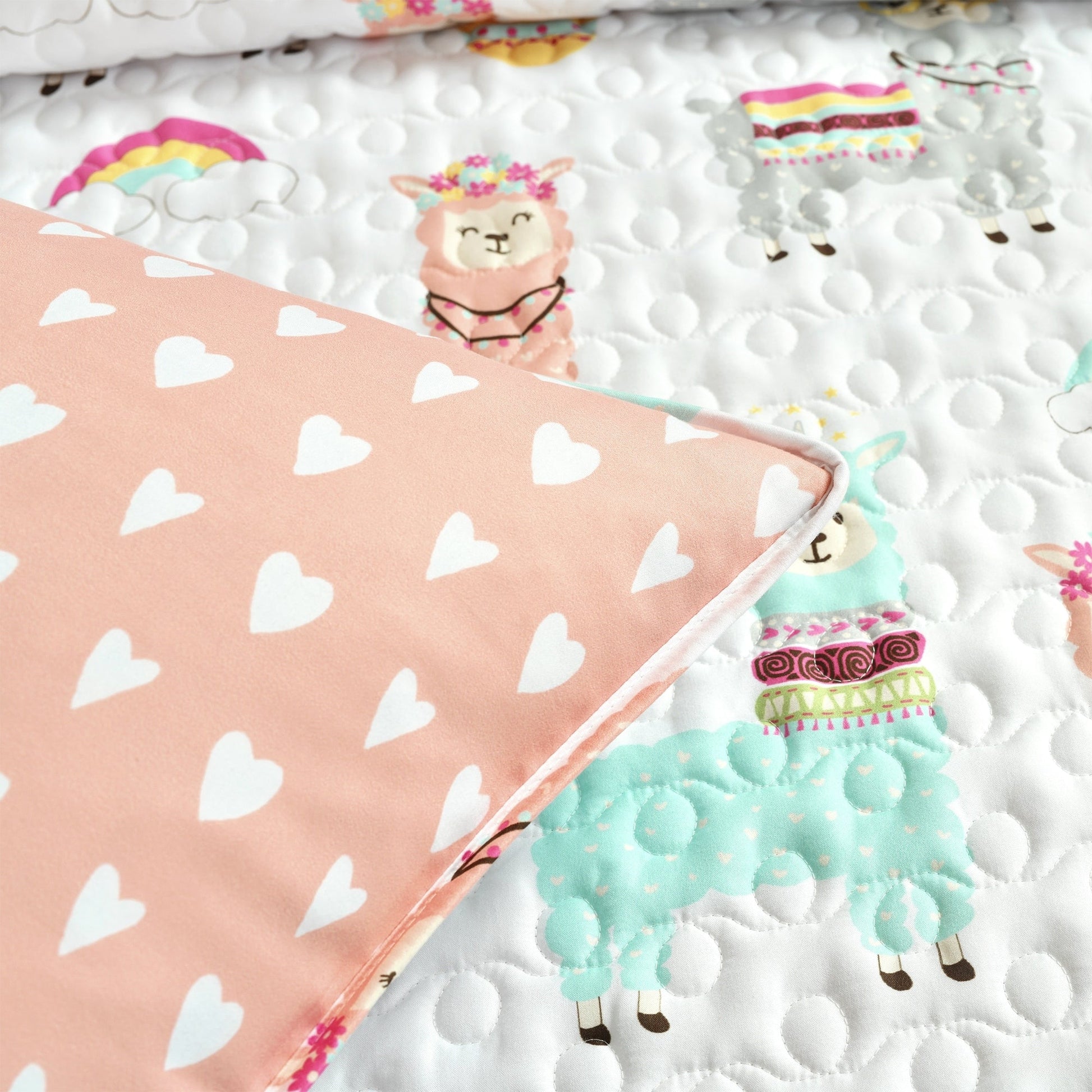When redecorating a child’s bedroom, you want a set that can grow with the child. This set is made to last through many washes and features a design that is versatile enough to be used for younger and older children and tweens. The llamas, cacti and rainbows combined in this print create the perfect look for your kid’s bedroom. When you’re ready to change it up, simply flip the quilt and shams over to the other side for a whole new look. The reverse side is a much more subtle pattern of small hearts against a solid color background.