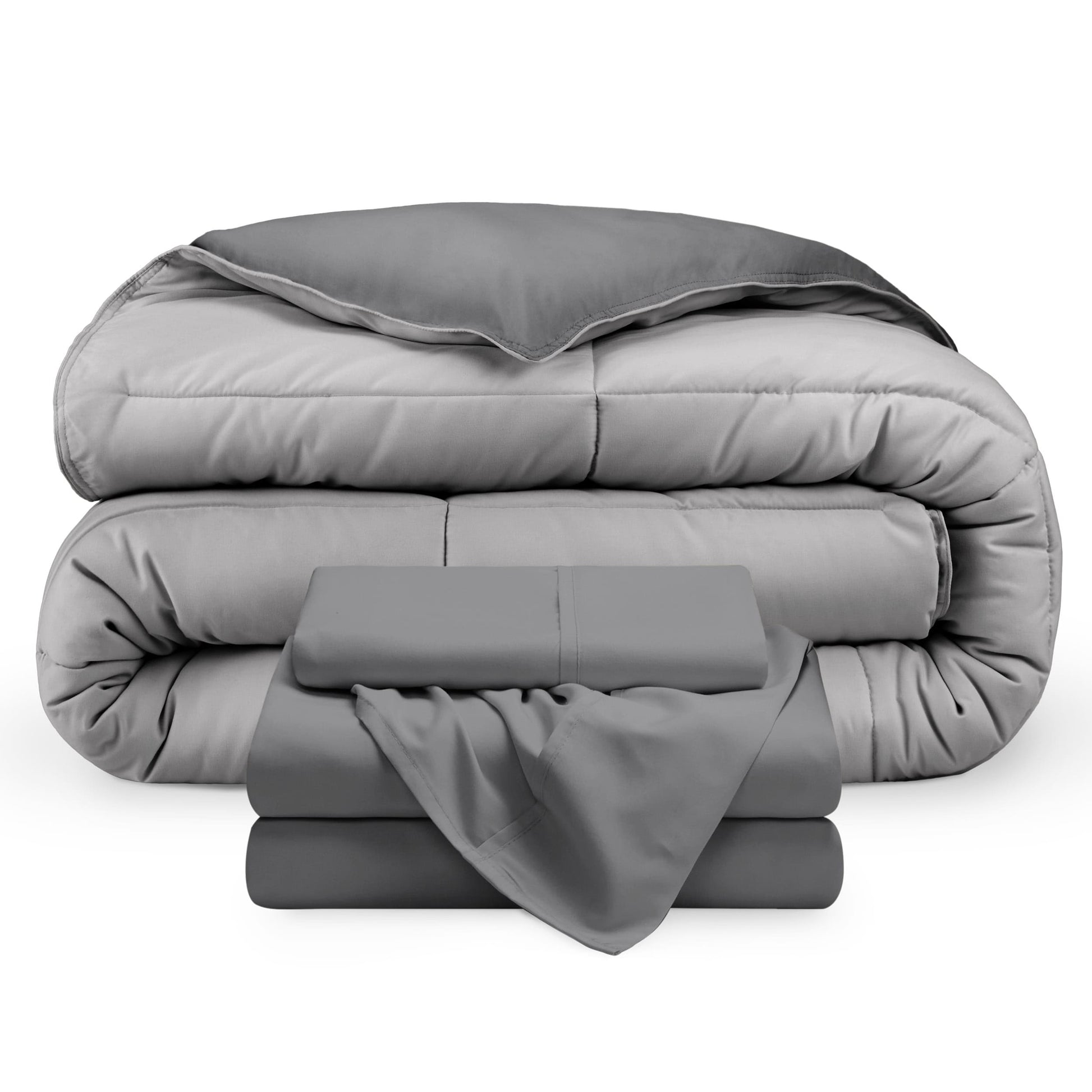 Upgrade your bedding game with the Bare Home Down Alternative Reversible Bed-in-a-Bag. This bedding set includes a reversible comforter and a microfiber sheet set. Made with 100% hydro-brushed microfiber and filled with goose down alternative polyfiber, the comforter is breathable, hypoallergenic, and double brushed for extra softness.