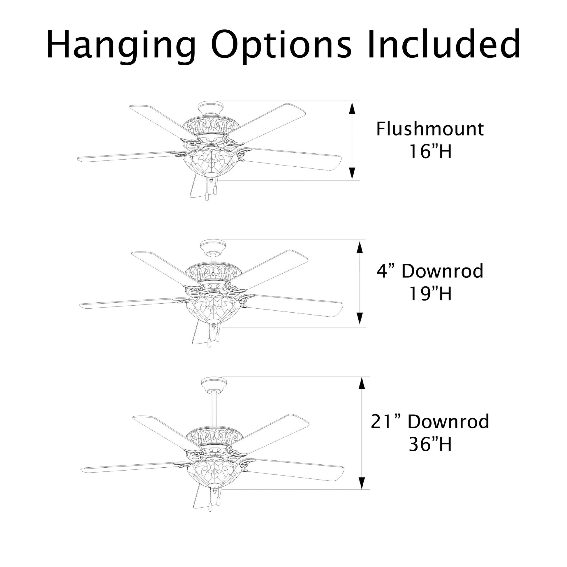 • Pull chain or remote control (included) for easy control of light strength and blade speed