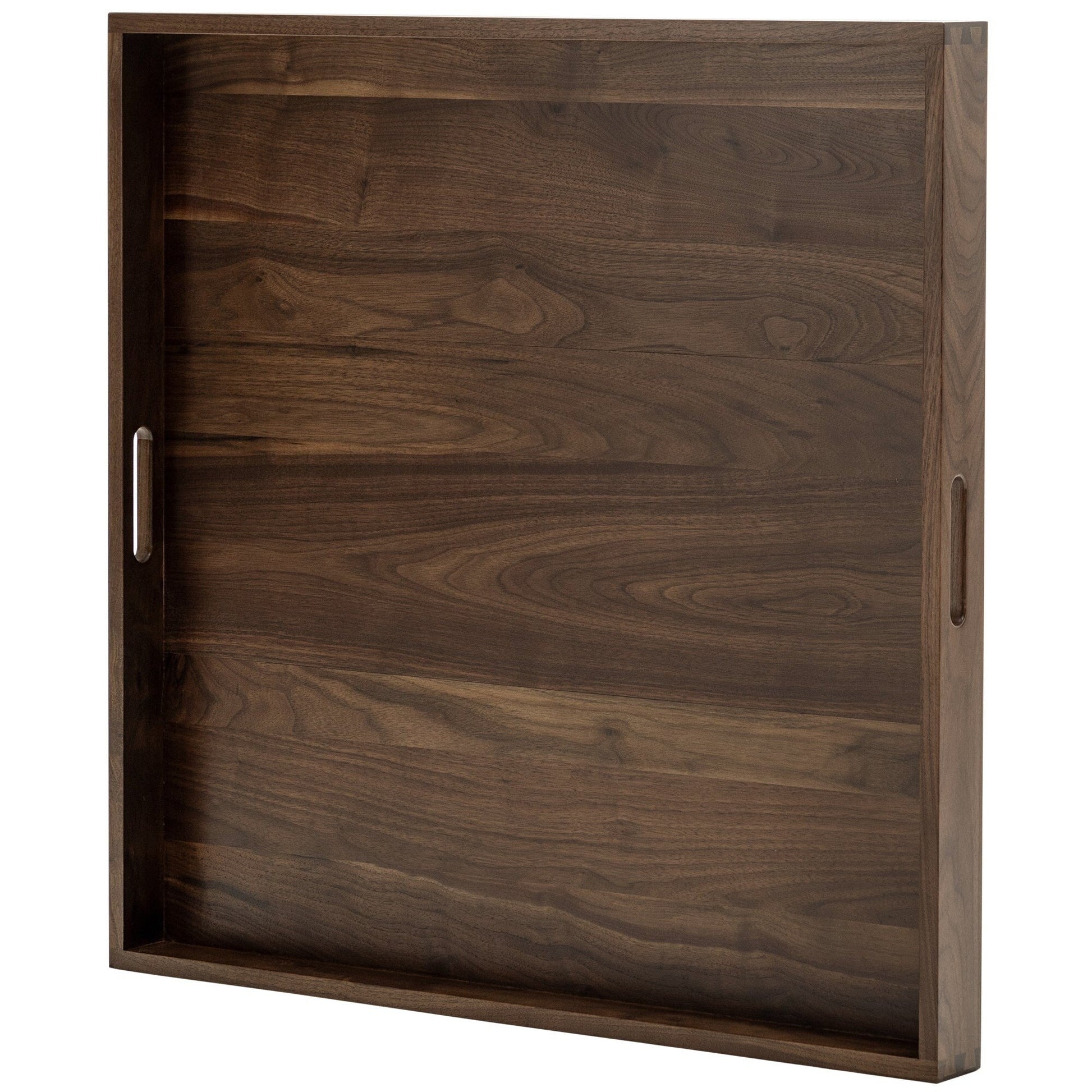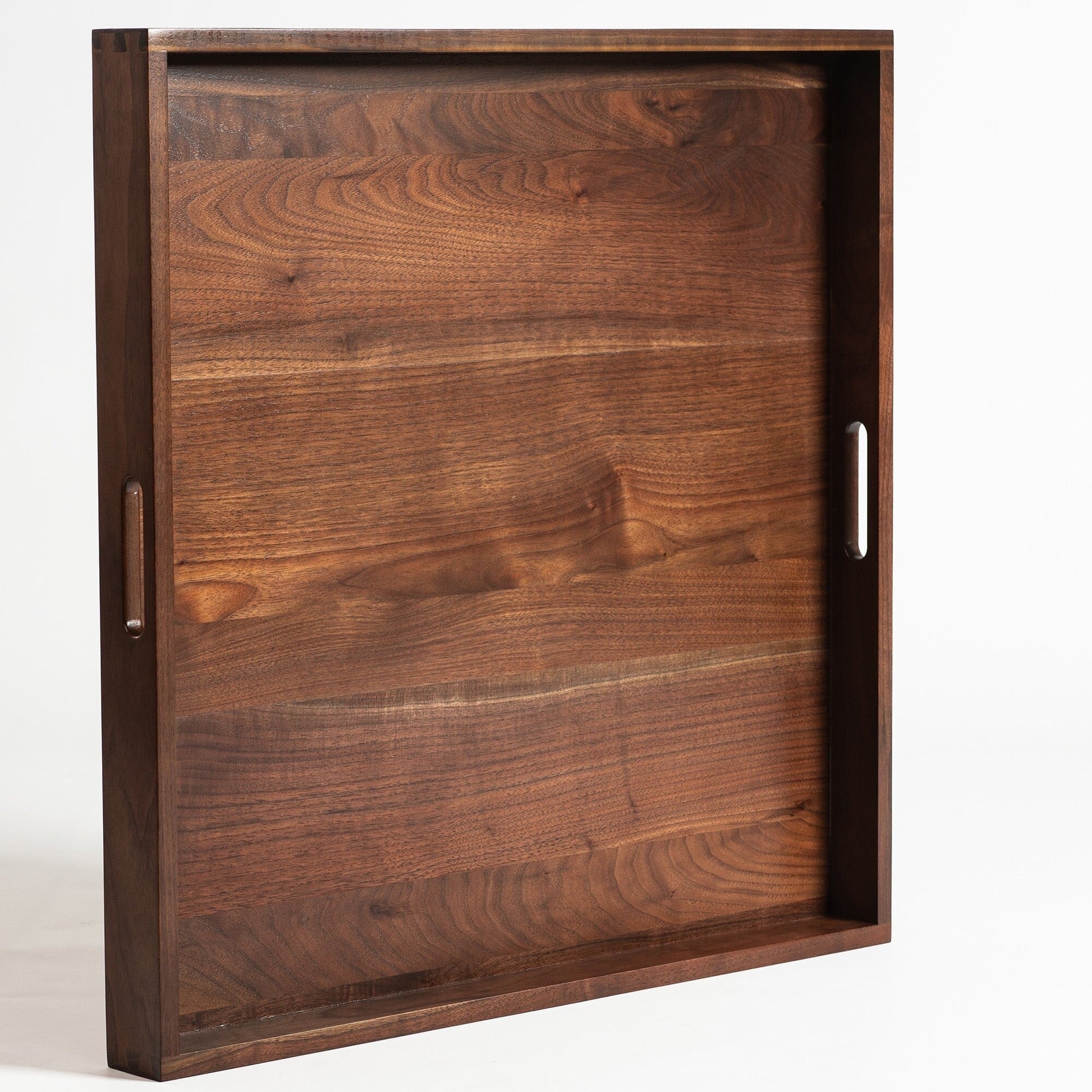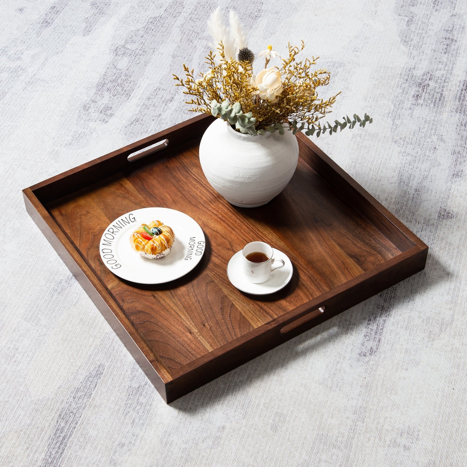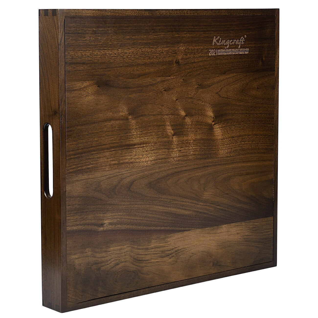 Impress your guests with this vintage Square Black Walnut Wood Serving Tray Ottoman Tray with Handles. Perfect for serving cheese, wine, snacks, meals, and tea while spending quality time with your loved ones or for serving drinks and coffee at hotels, bars, or coffee shops. The generously sized tray boasts a simple and elegant design with handles on each side for easy carrying. Crafted from 100% FSC-certified solid black walnut wood, this tray features a well-sanded smooth surface with no splinters or sharp corners, providing a great handhold feeling. Plus, it's 100% handmade with a mortise and tenon joint structure, making it sturdy without the use of any nails.