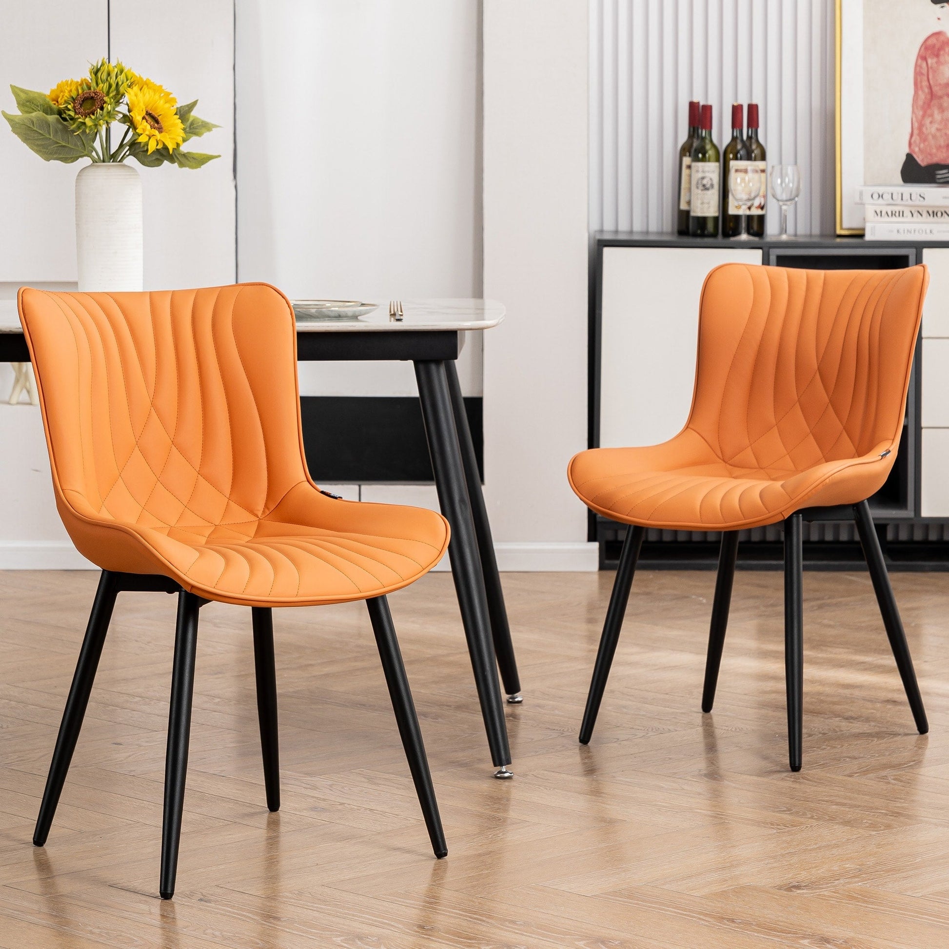 💞Surround your dining space with a set of dining chairs that not only bring your decor to life, but also conform to your body's curves for added comfort. Featuring lovely whales' tail stripe, leather upholstered seats and sturdy metal frames for durability, this dining chair's multi-materials accentuate the overall contemporary style. With no arms, our sophisticated dining chairs can be easily nestled into table voids to save space and are the perfect balance of stunning style and convenient functionality. These kitchen dining room chairs are versatile and suitable for a variety of settings, including dining rooms, kitchens, living rooms, guest rooms, waiting rooms and even vacation homes. They can be used as cozy reading chairs, comfortable corner cushions, makeup chairs, lounge chairs etc.