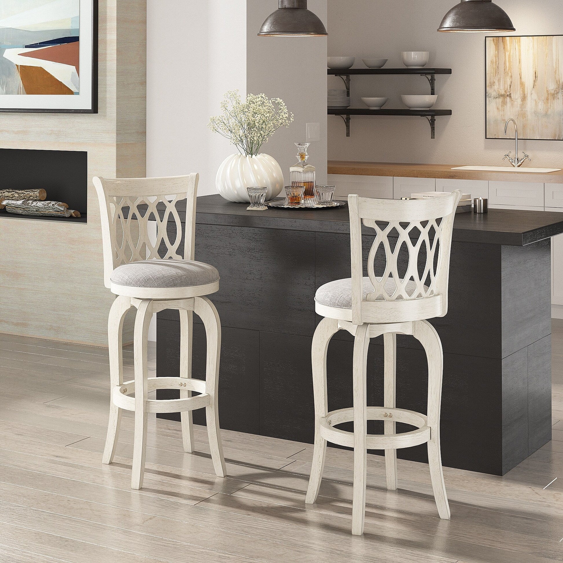Constructed of durable rubberwood, this Scroll Back Linen Swivel Stool displays a beautiful, classic style and offers comfortable support for everyday dining. A rich wood finish completes the chair's frame, while a footrest and upholstered seat provide improved comfort for daily use. The swivel function of this stool provides advanced mobility and makes it easy to have a casual conversation with friends and family during mealtime. The solid Scroll Back design adds additional cushion and support, so you can look forward to sitting in this seat.
