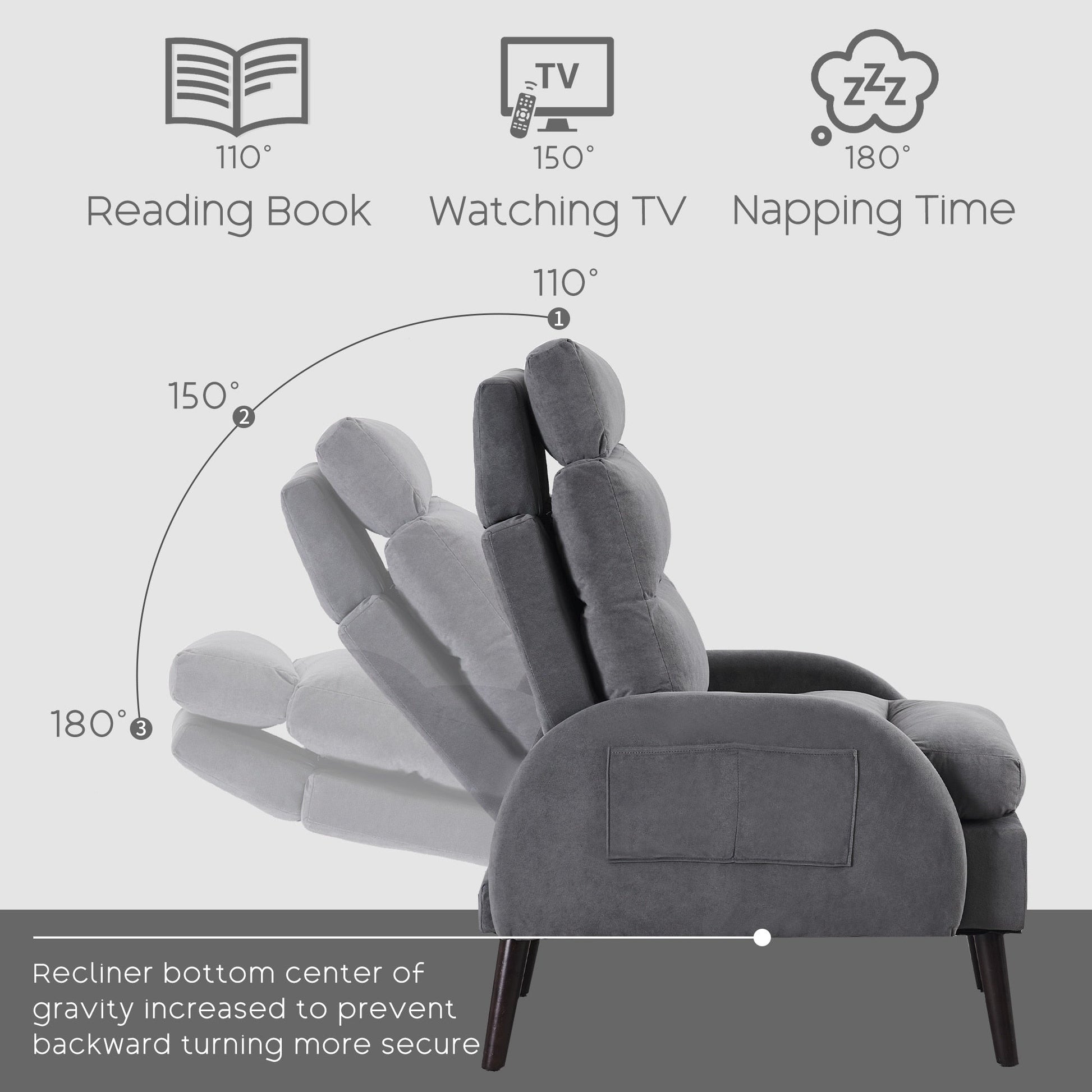 - Adjustable Comfort: Featuring three backrest settings at 110°, 150°, and 180°, this accent chair is designed to accommodate various seating preferences and relaxation needs. Whether you're lounging, reading, or watching TV, you can effortlessly adjust the chair to find the perfect position for optimal comfort.