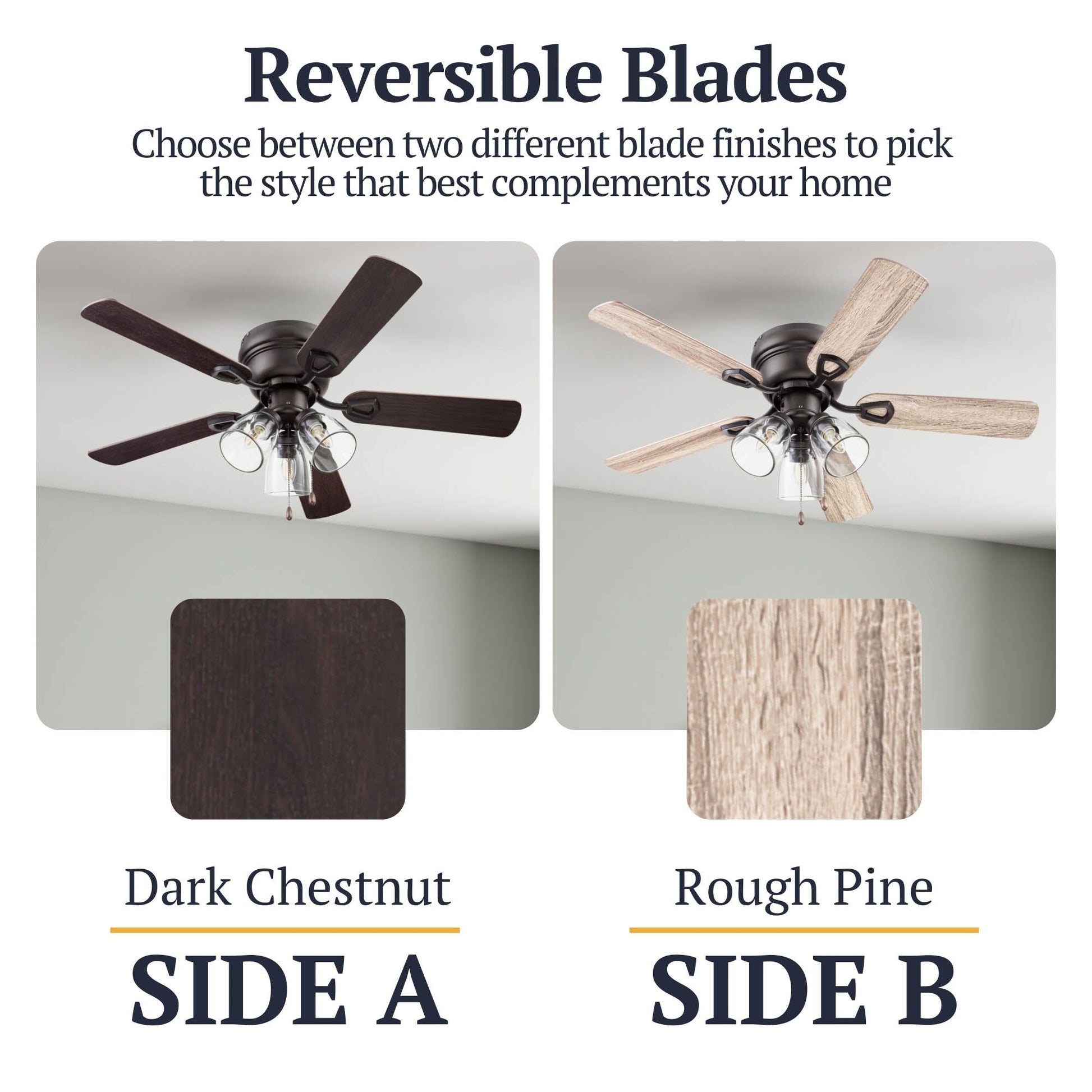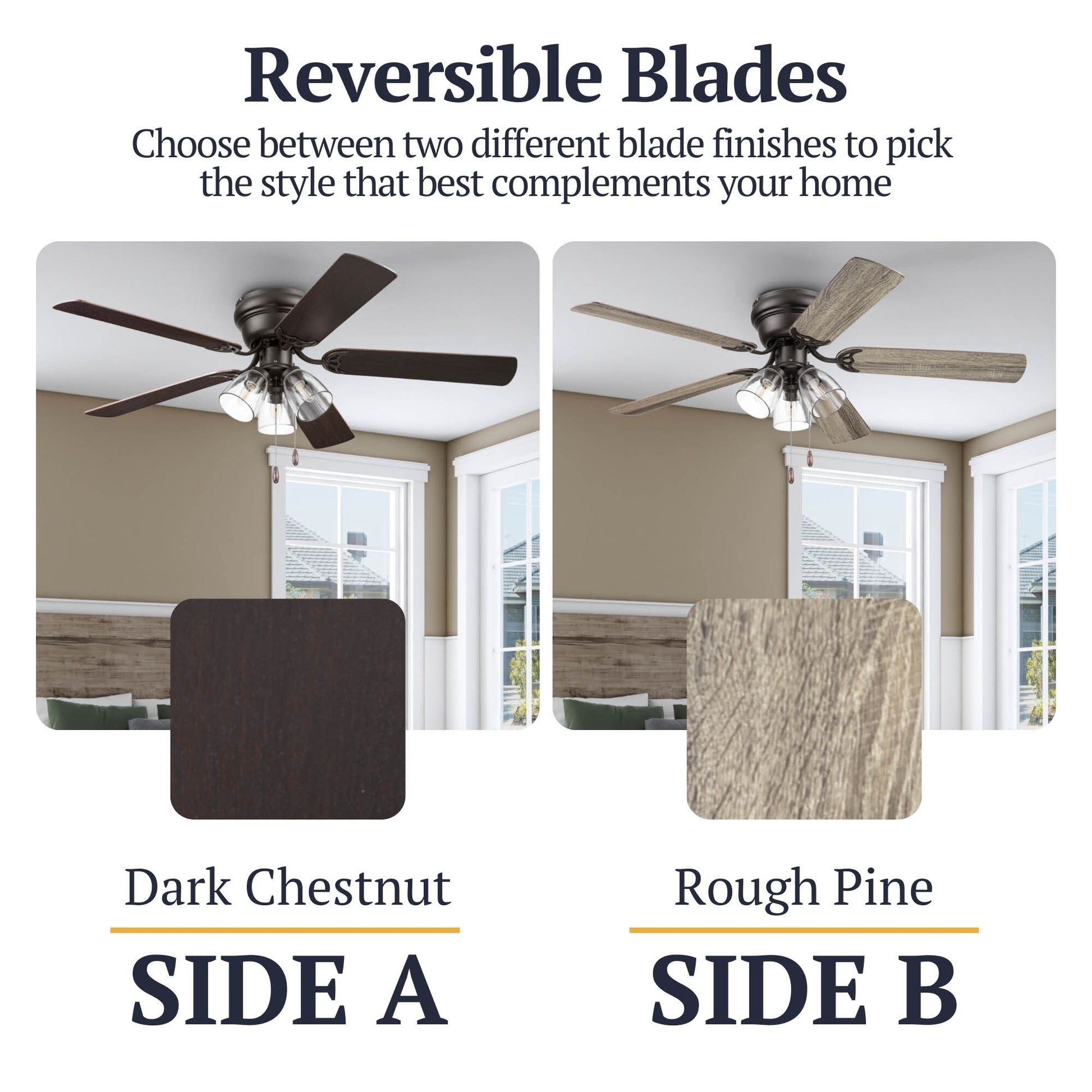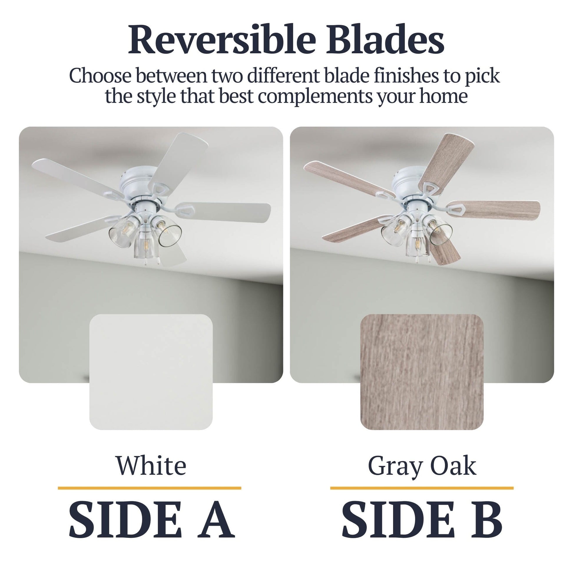 • DUAL-FINISH REVERSIBLE BLADES: The style is up to you! This ceiling fan comes with a different finish on each side of the blades. One side comes in a beautiful Light Oak finish, while the other side showcases a complementary Gray Oak finish. Pick the look that best fits your space!