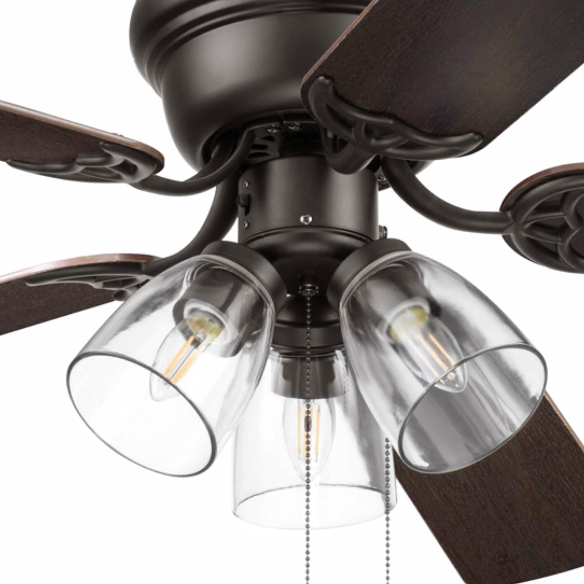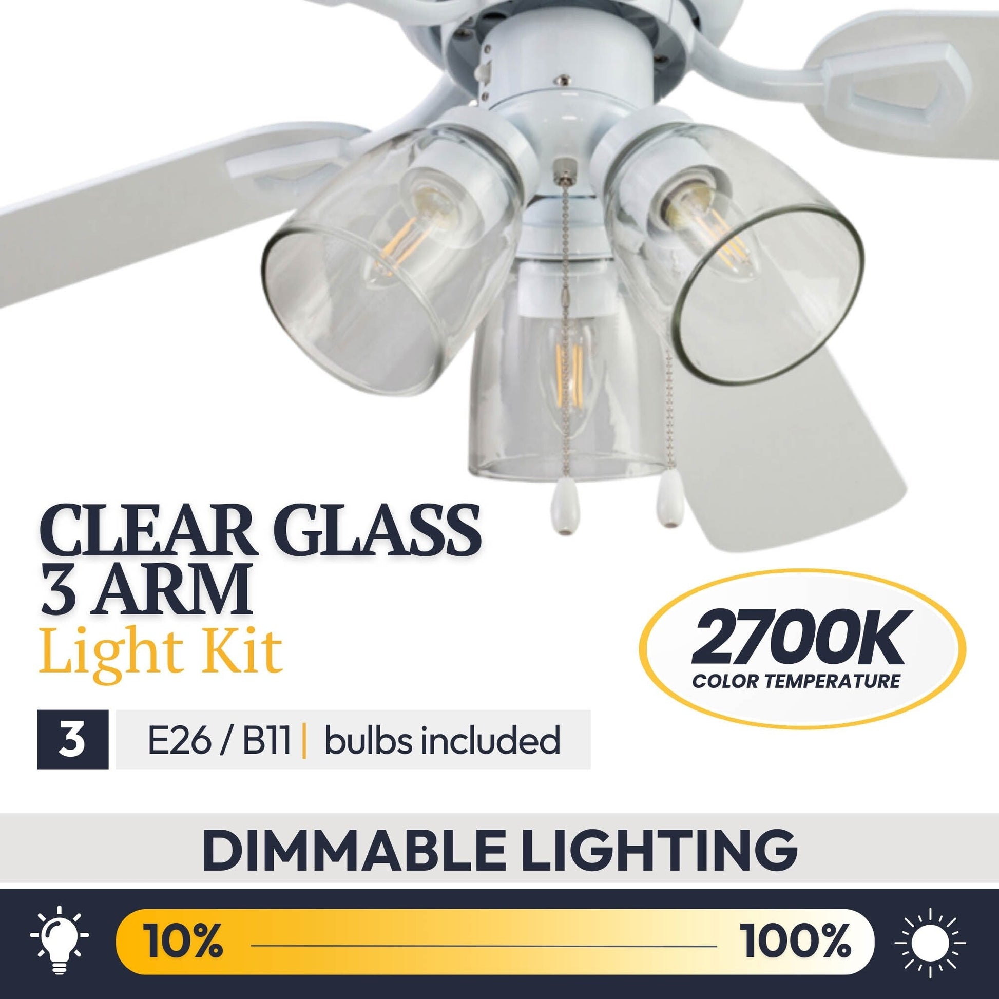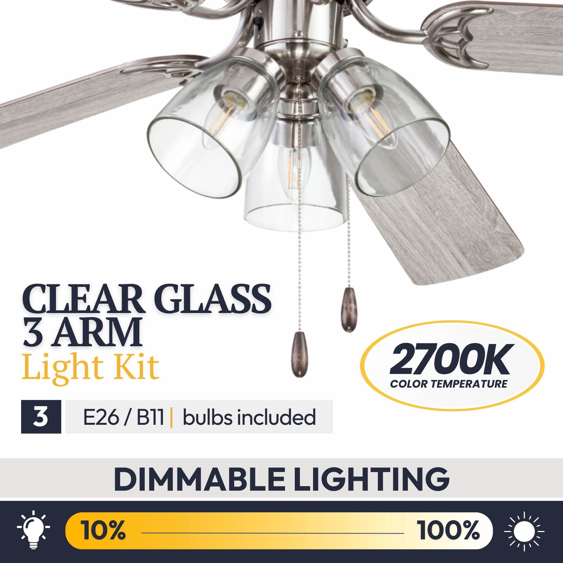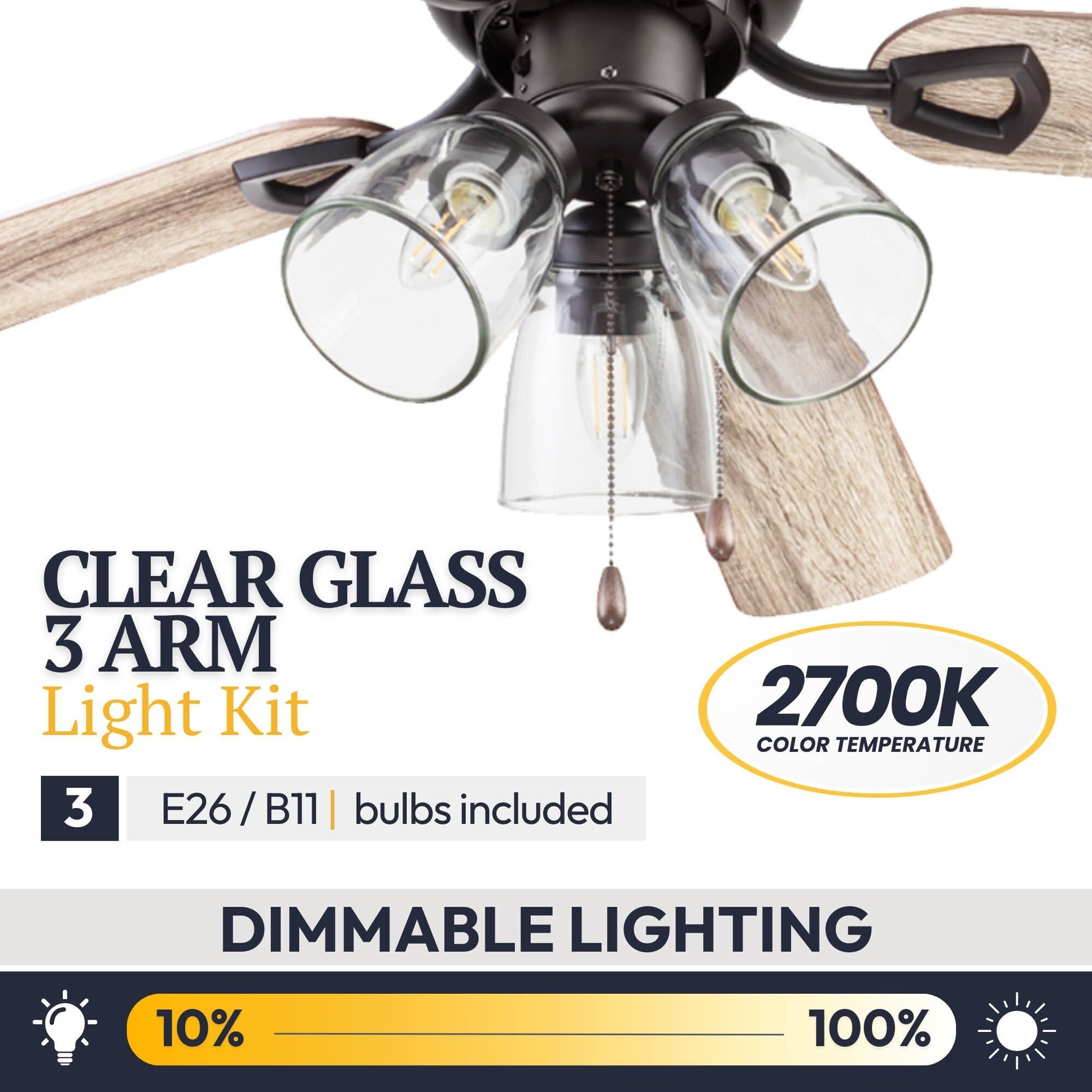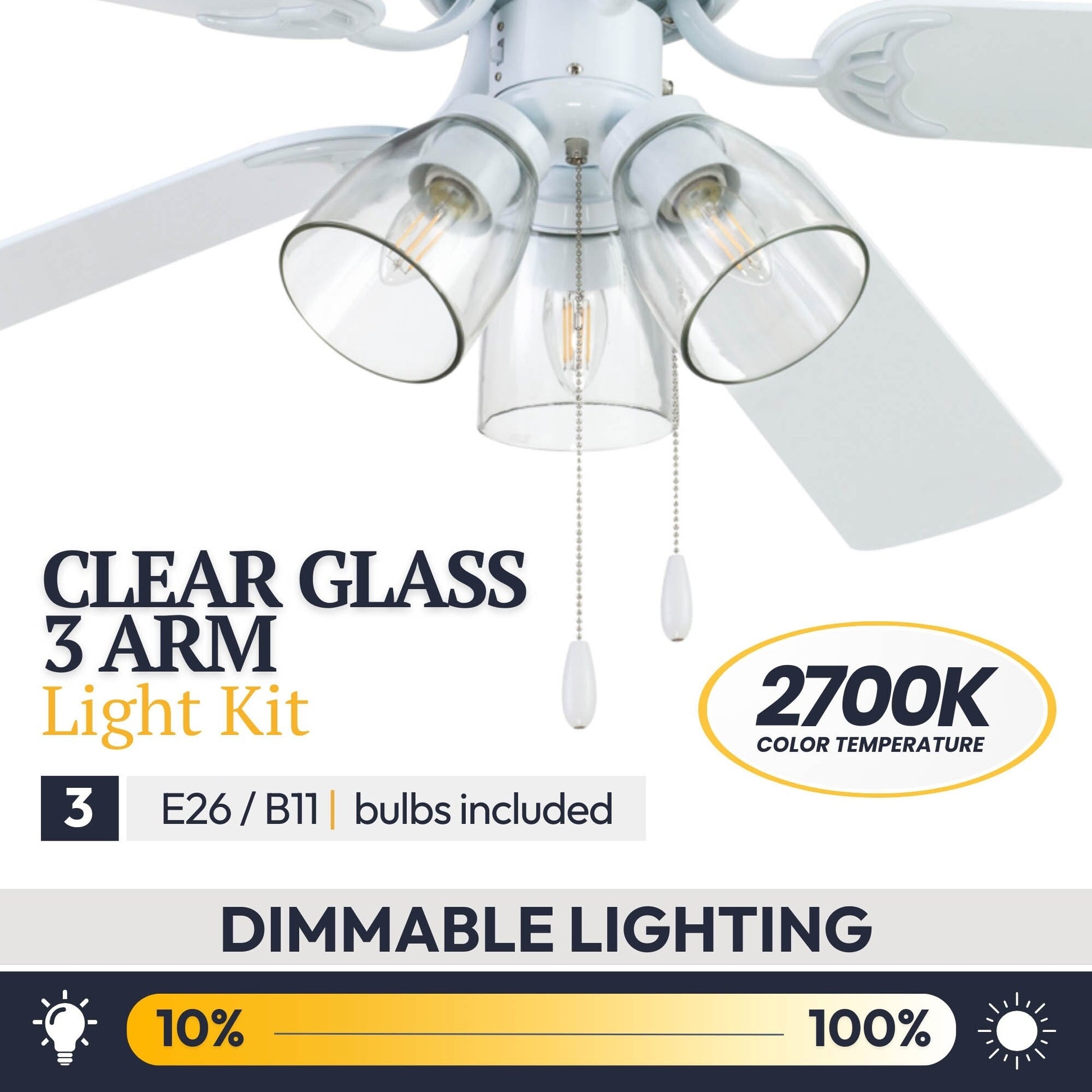 • CLEAR GLASS: This indoor ceiling fan features a clear glass branched light kit housing 3 E26/Medium (Standard)/B11 bulbs(included).