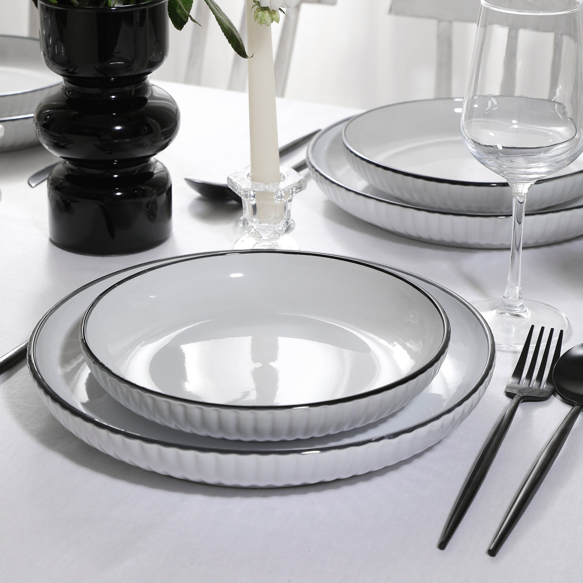 • Bord blanc-noir : Le grès blanc est classique, tandis que le bord noir fin ajoute une touche d'intrigue et d'intérêt visuel.