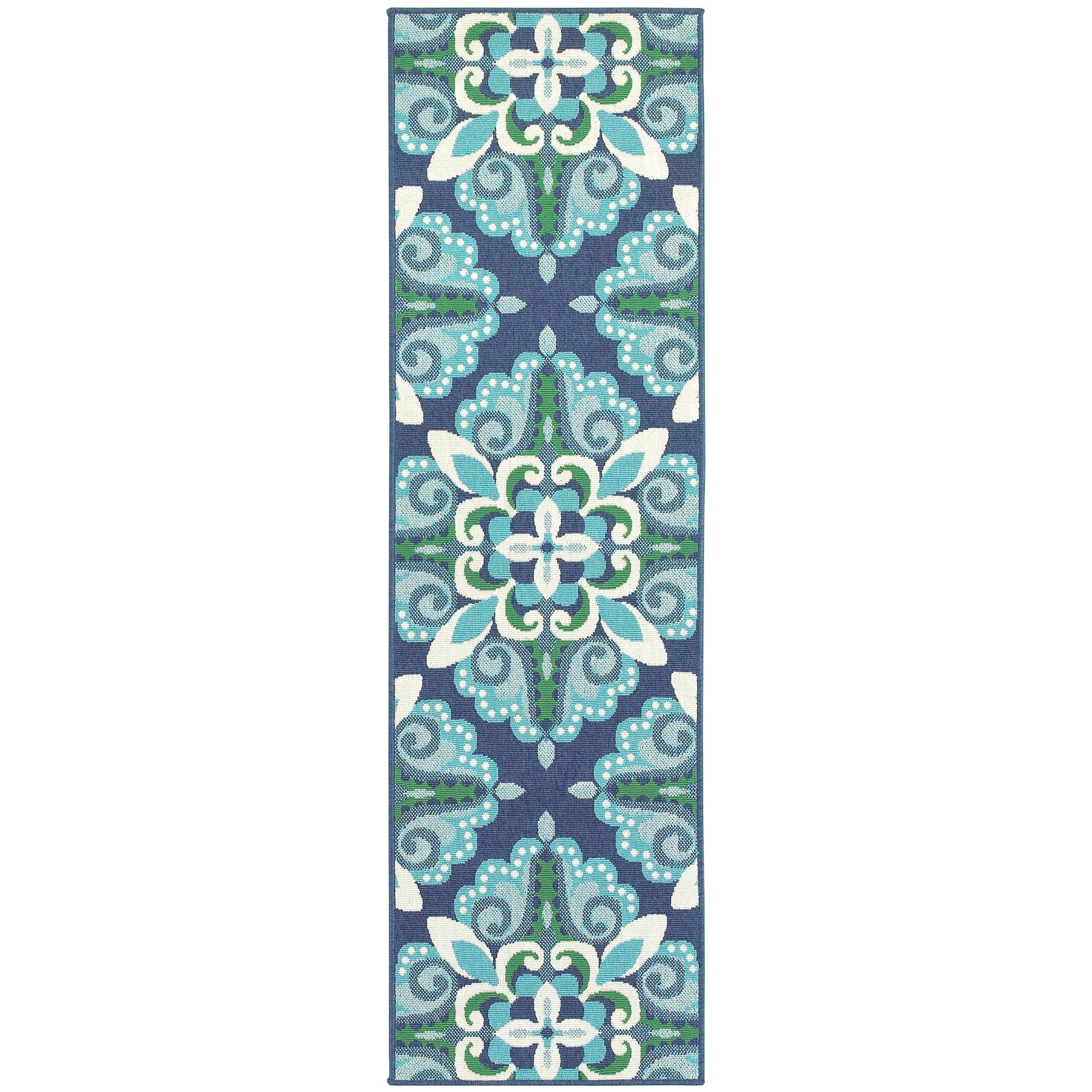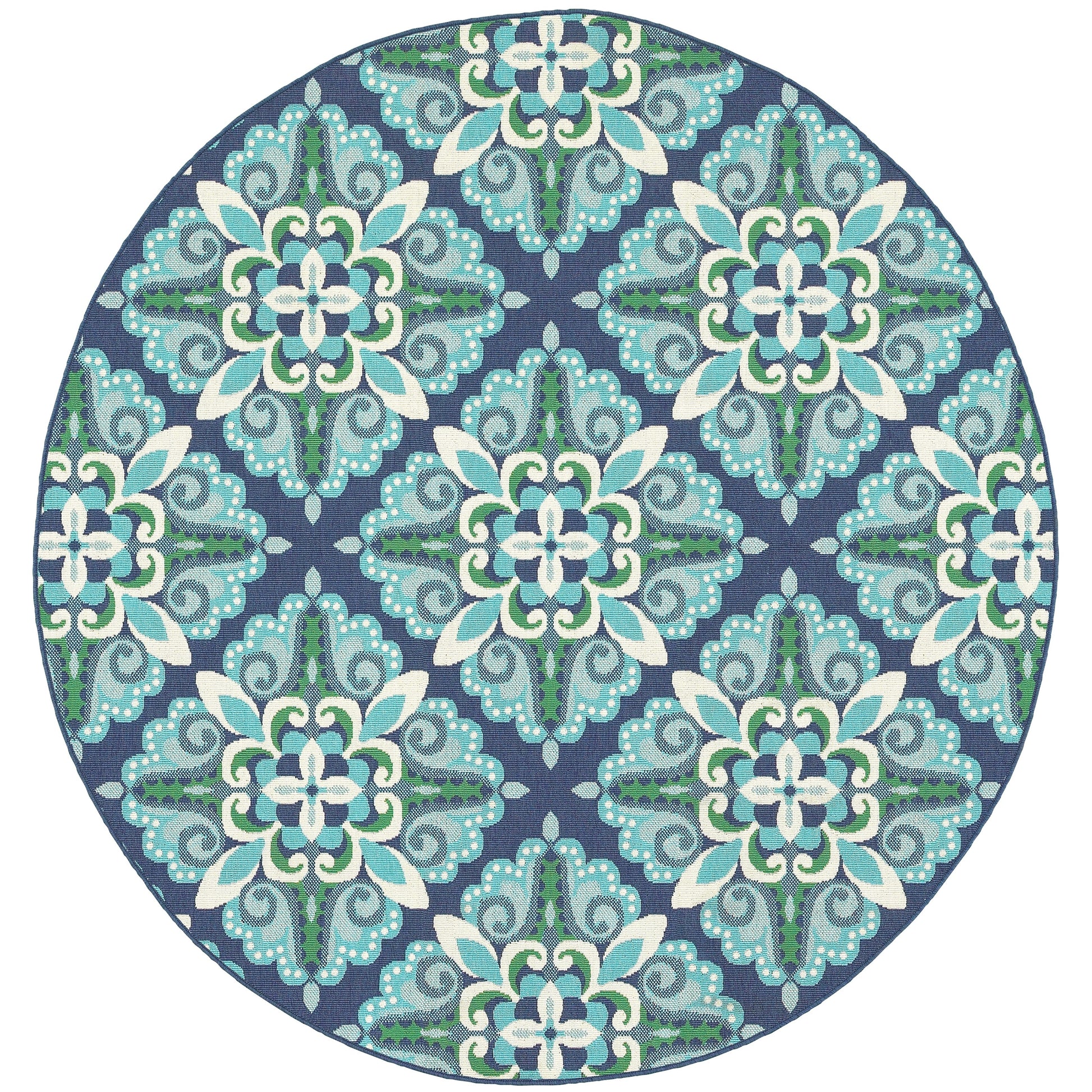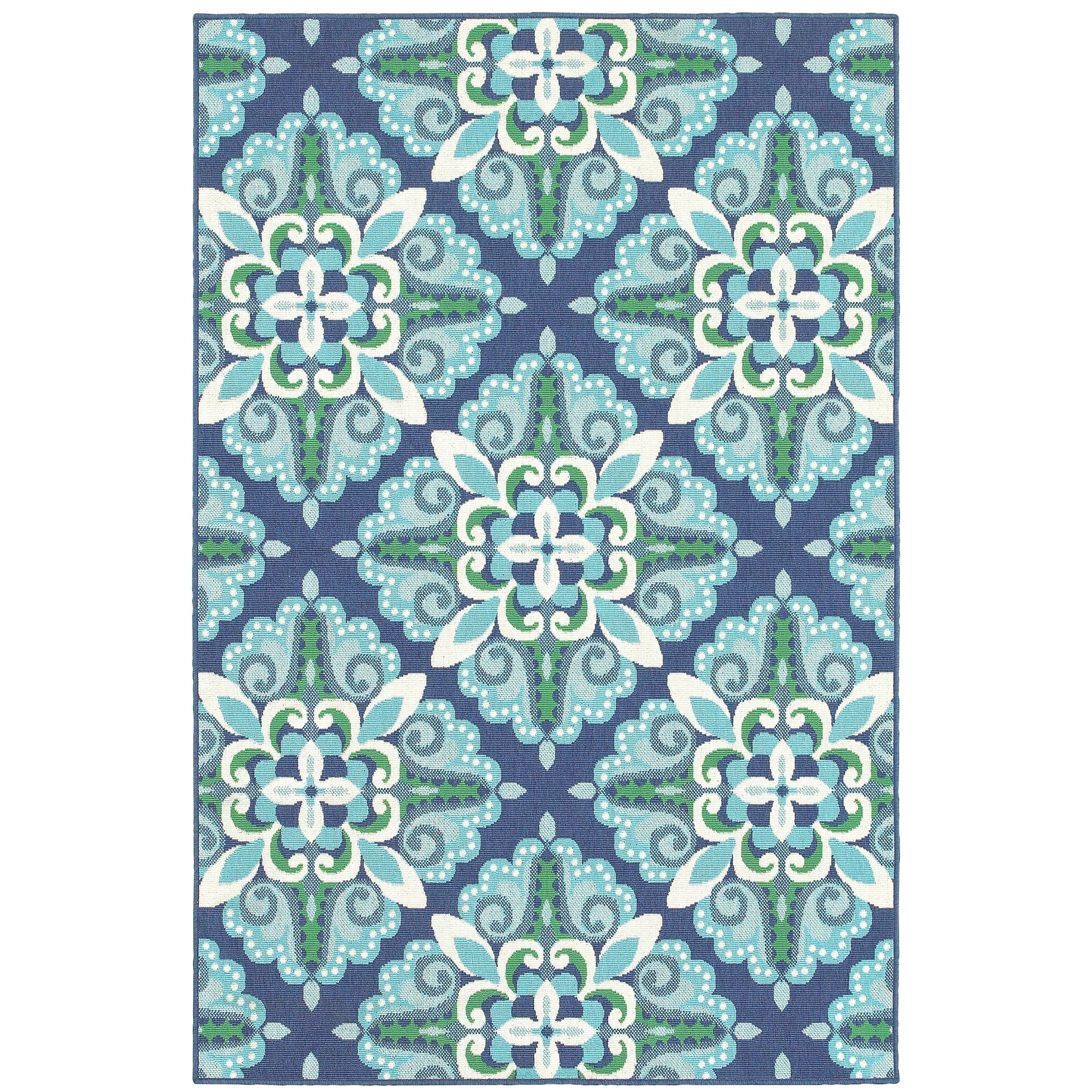 Add a pop of color to your outdoor space with the Martinque Medallion indoor-outdoor area rug. This Moroccan-inspired rug features a vibrant blue and green medallion pattern that is perfect for creating a contemporary aesthetic. Power-loomed from 100% polypropylene, this rug is weather-resistant, stain-resistant, and fade-resistant, ensuring easy maintenance and long-lasting durability. With a low loop pile height of 0.15 inches, this rug is ideal for high traffic areas and easy to clean. Choose from a variety of sizes to perfectly suit your porch or patio.