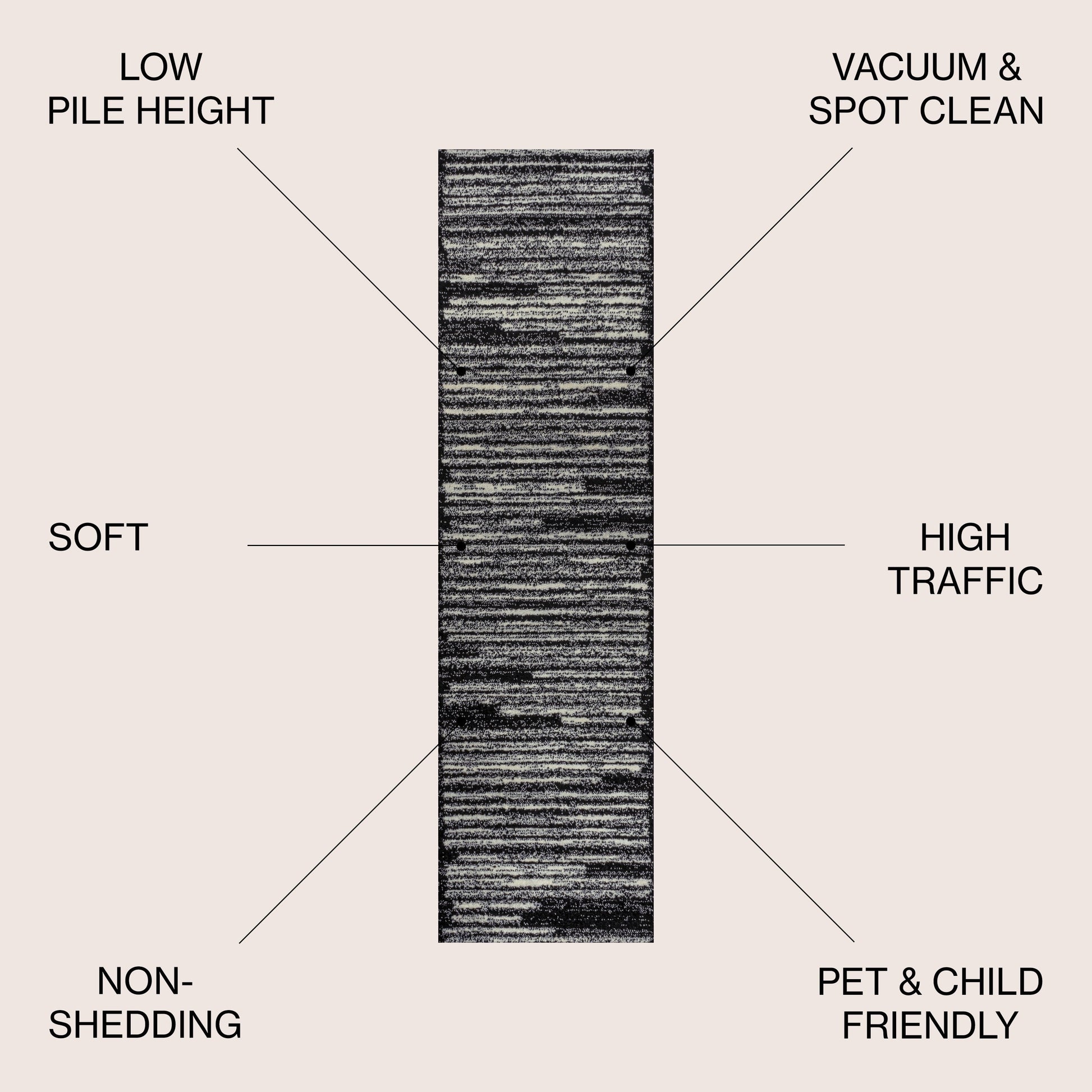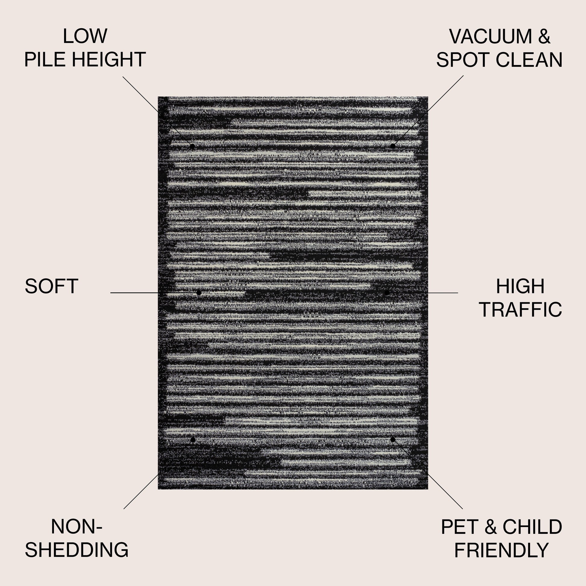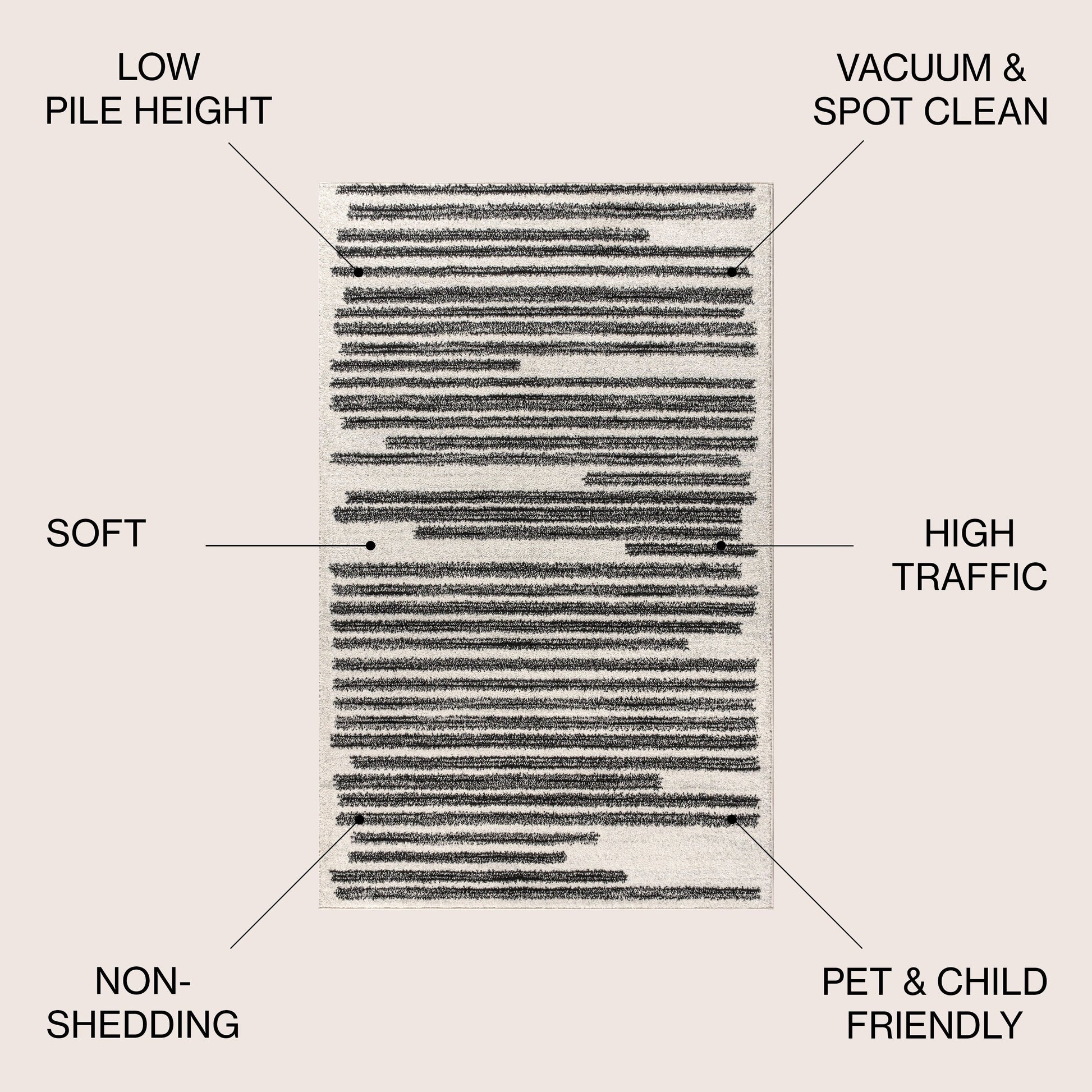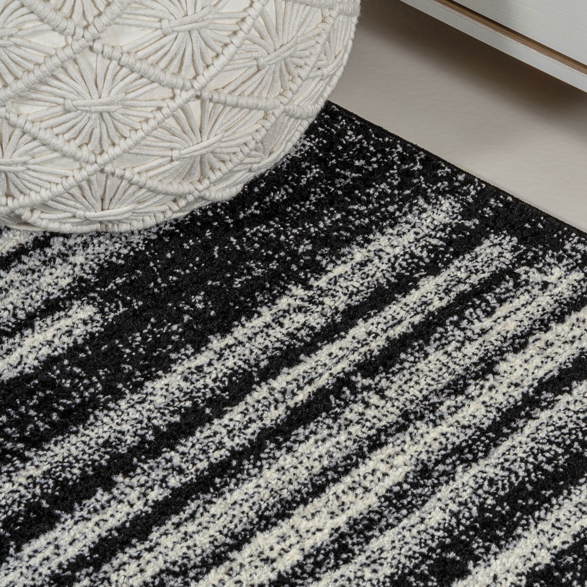Inspired by vintage Moroccan rugs, our modern striped rug is power-loomed with a short pile. The offset stripe and bar pattern is woven in black on an ivory background; the mingled threads recall traditional handwoven rugs. Add some mid-century style to your home with this easy-care rug.